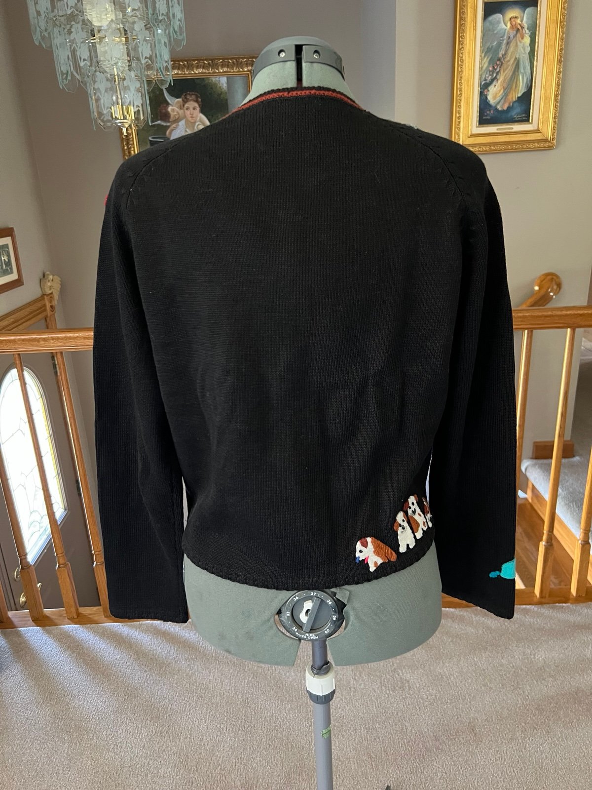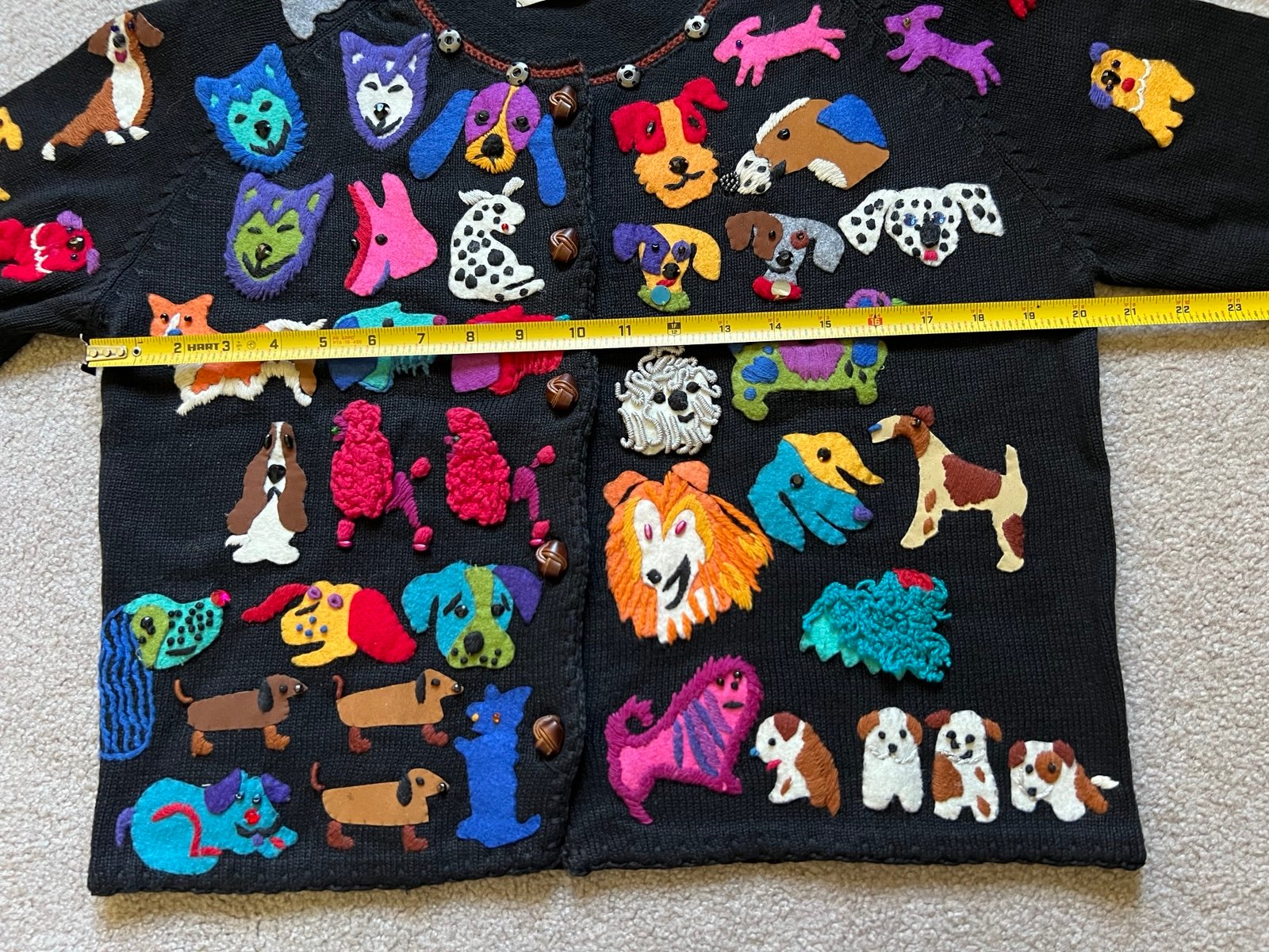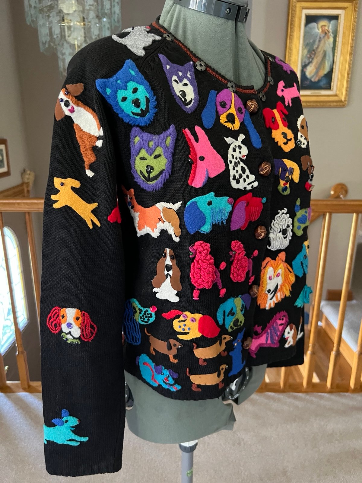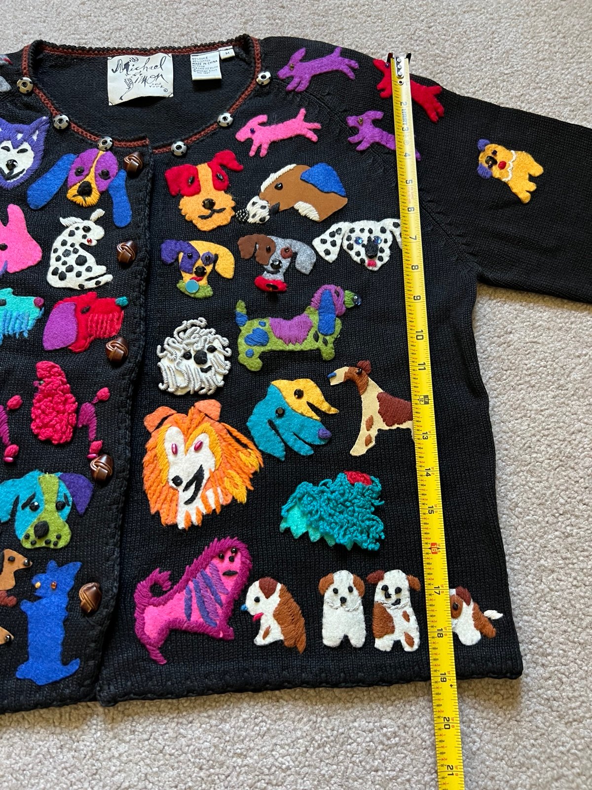 The price is firm. But it now only. This sweater is a unique michael simon collectible sweater. Perfect collectors piece for the Fran Drescher lover. She wore this style on the TV show the Nanny back in the 80’s and 90’s. Multiple breads of dogs and multi color embroidery. The sweater is EXCELLENT CONDITION. just jaw dropping. Tag reads sz MED -Measurements are in the pictures. Comes from a smoke free pet free clean home. No returns. Please see my other design options, Michael Simon, and Berek sweaters listed